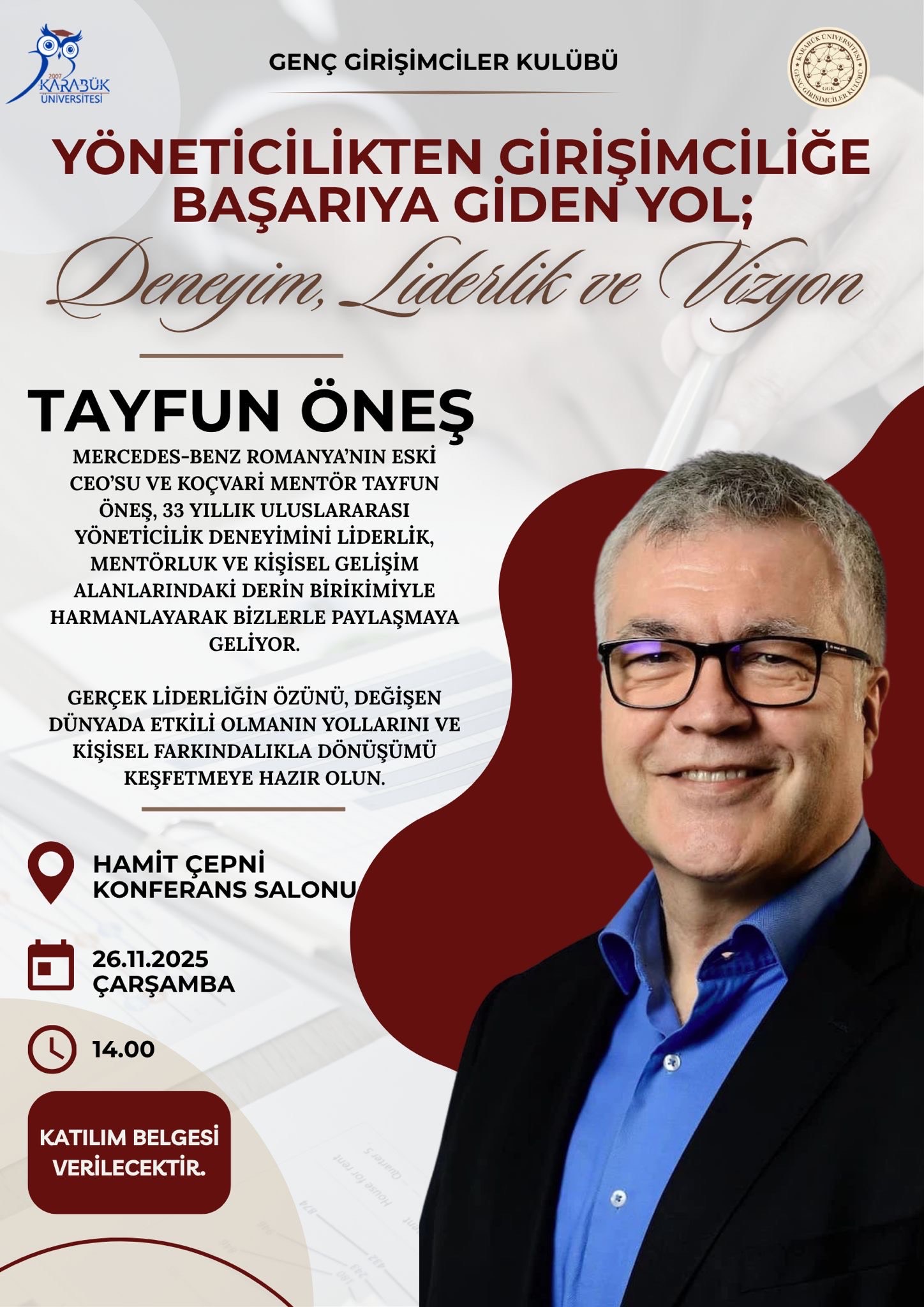 Mercedes-Benz Romanya’nın eski CEO’su ve Koçvari mentör olarak tanınan Tayfun Öneş, 33 yıllık uluslararası yöneticilik deneyimini, liderlik, mentorluk ve kişisel gelişim alanlarındaki birikimiyle harmanlayarak öğrencilerimizle paylaşacak.